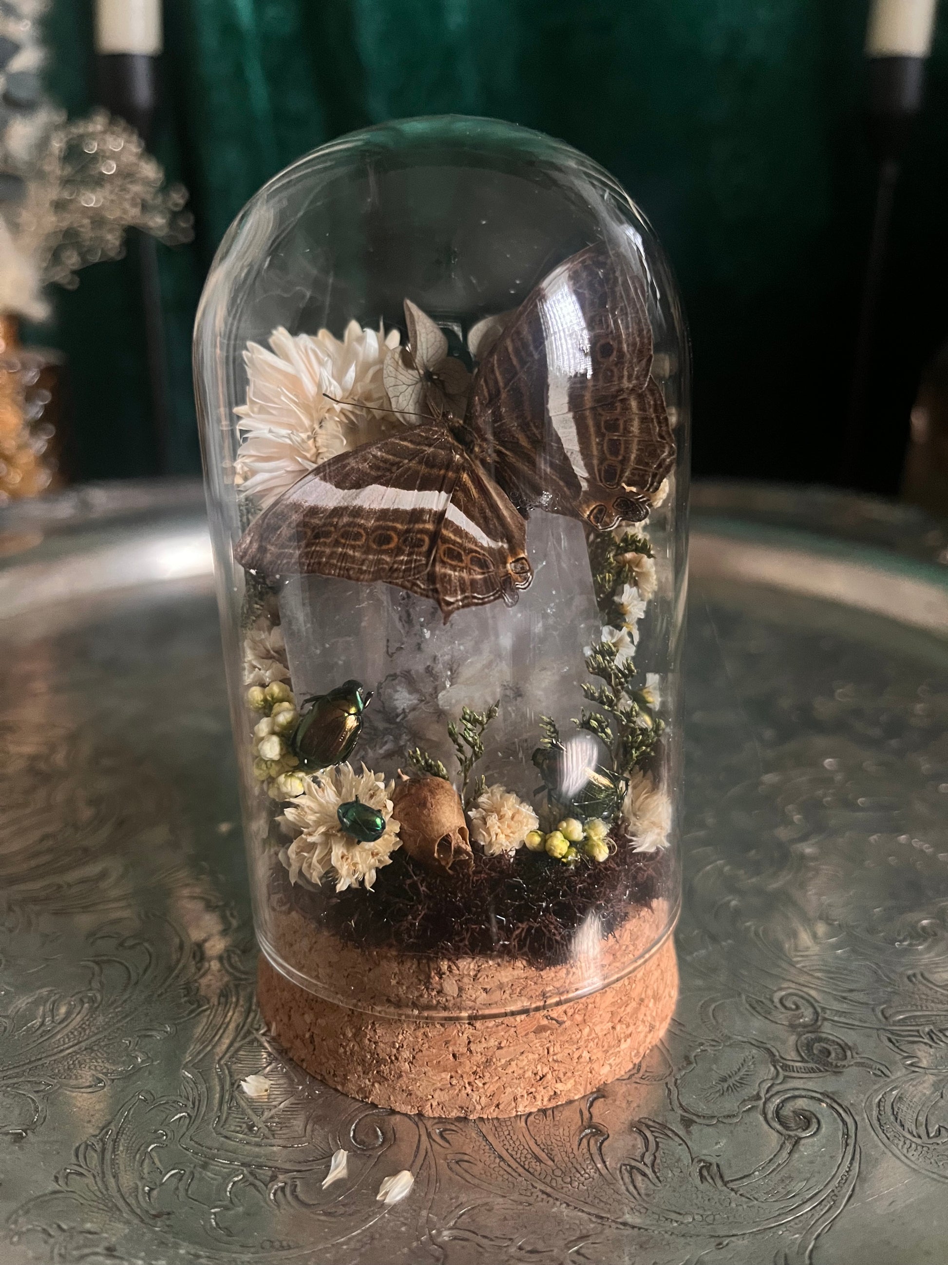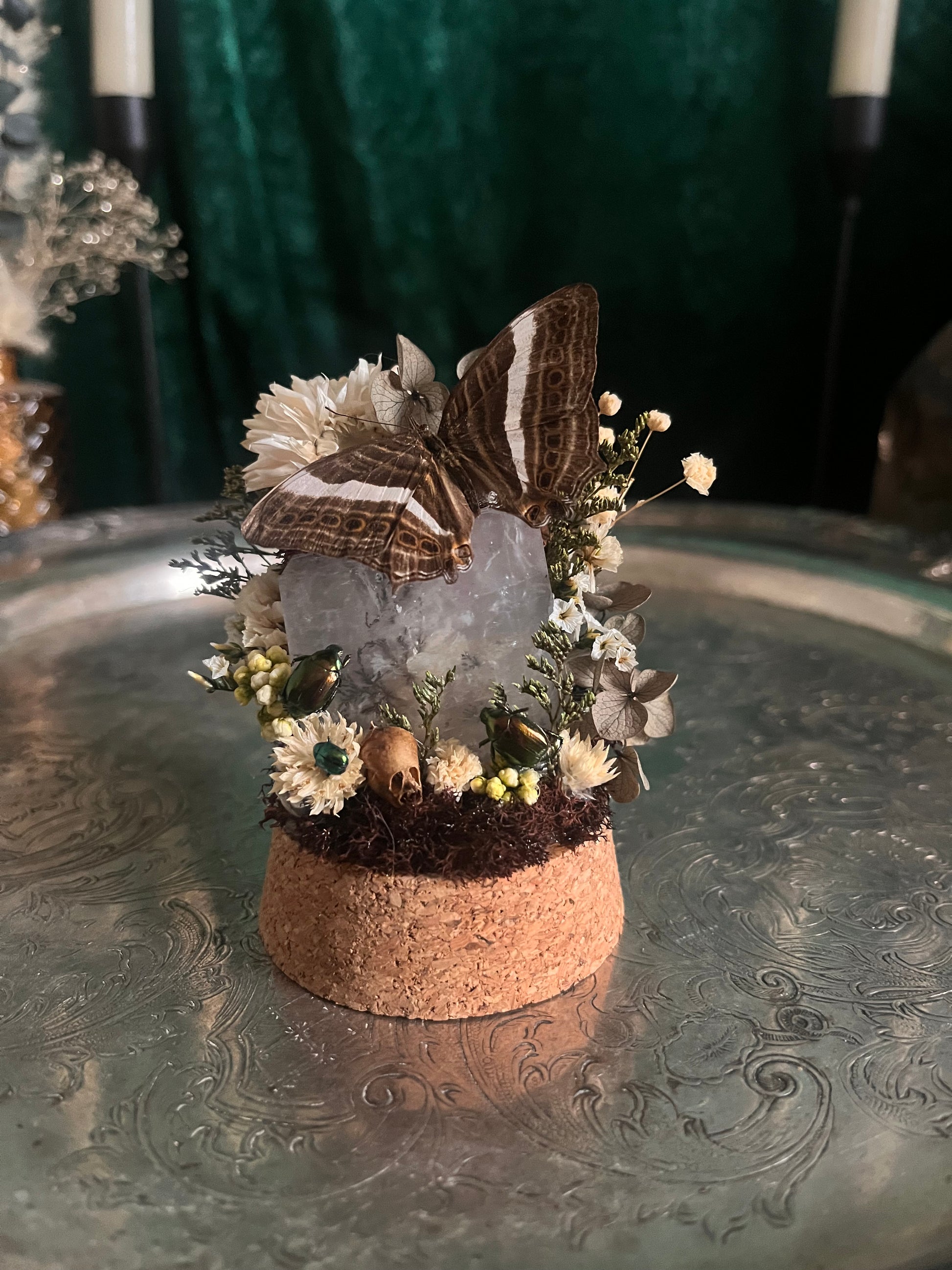 This mini dome contains a dendric piece of quartz, a many banded butterfly, and dried florals.