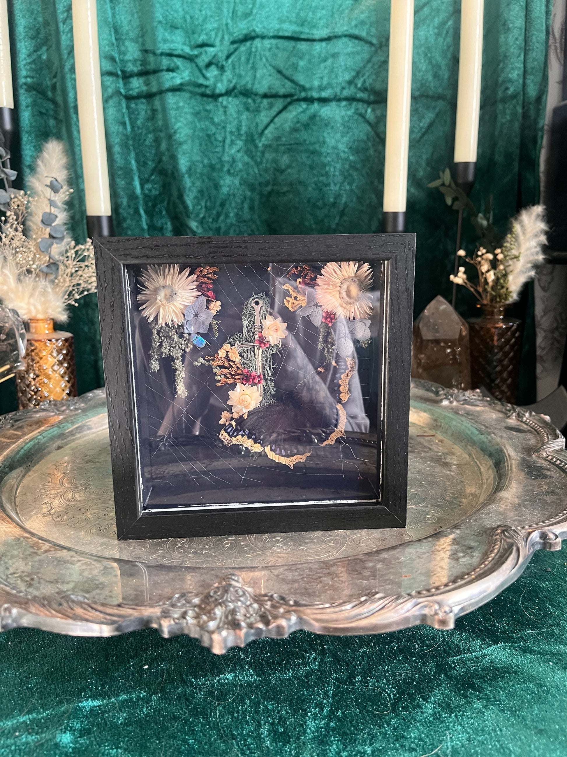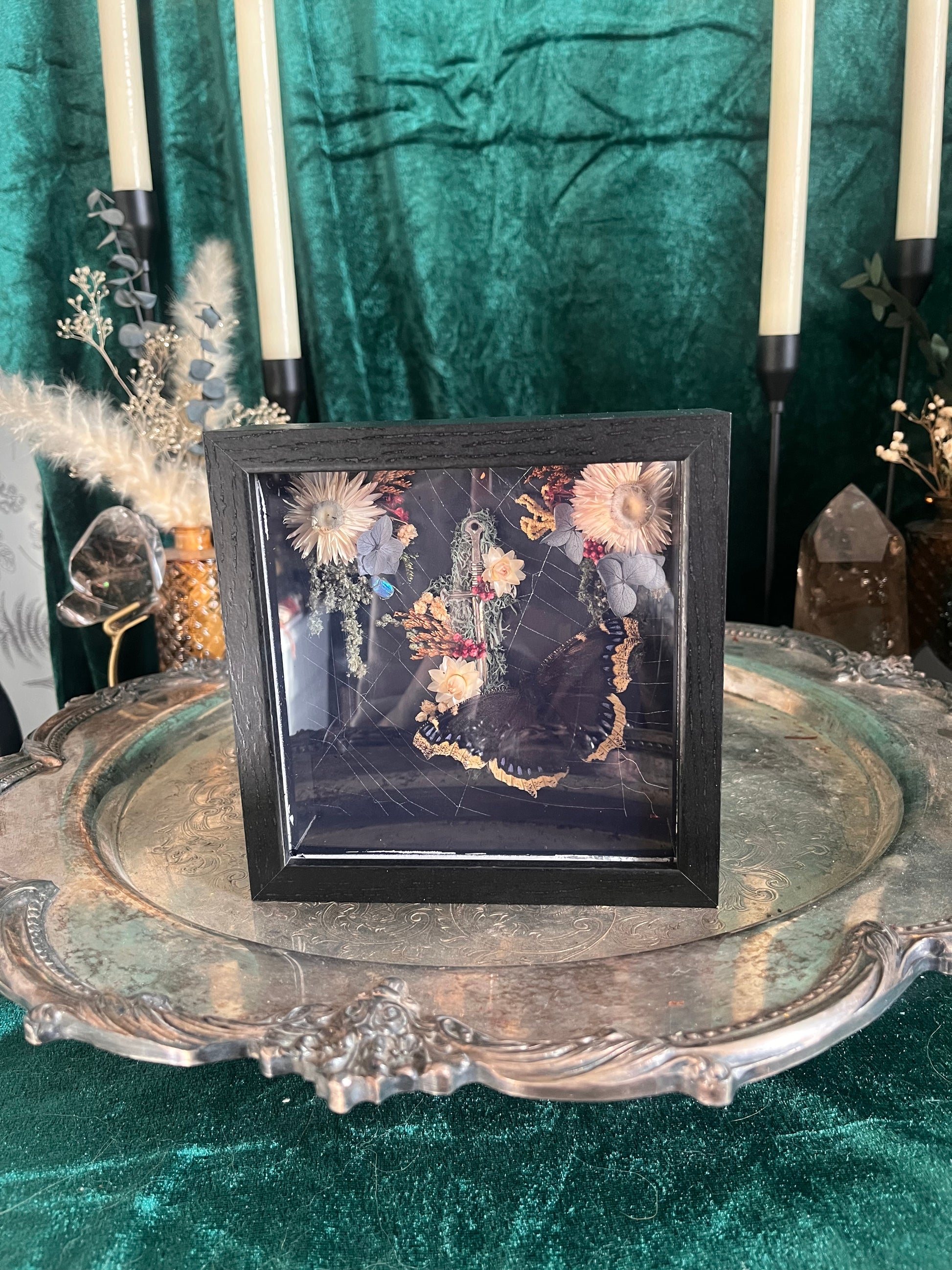 Small dagger frame with a preserved spider web backing, a mourning cloak, and a violet chaffer beetle