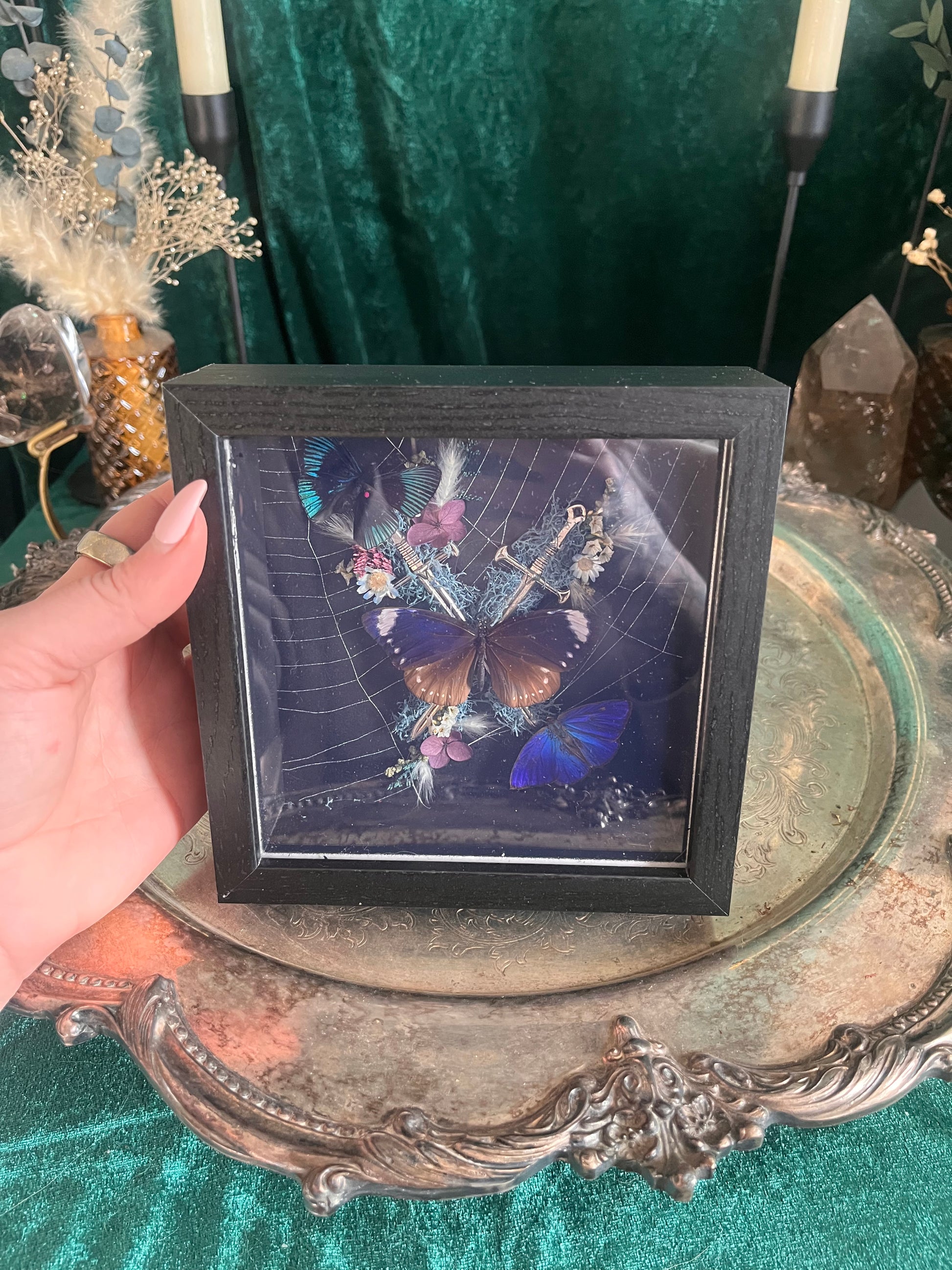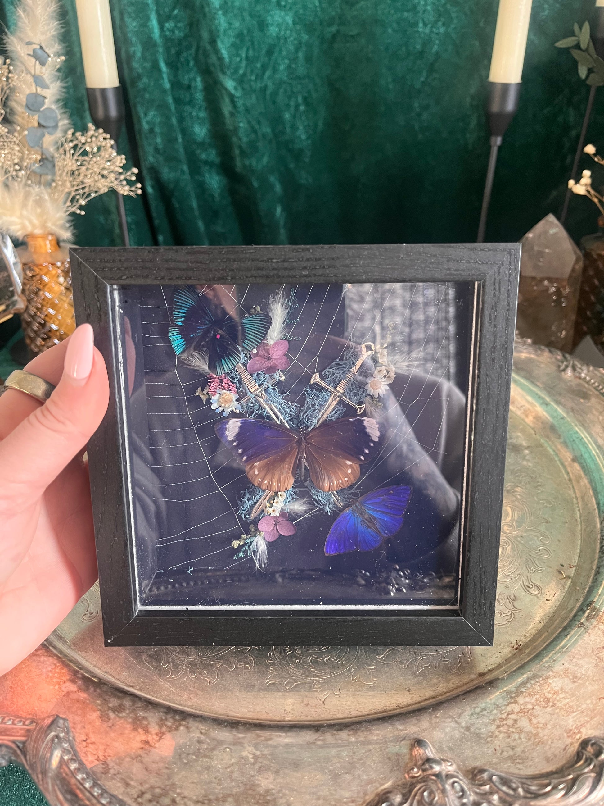 A small dagger frame with a preserved spider web backing, an apollo metal mark, a blue hairstreak, and a blue crow butterfly