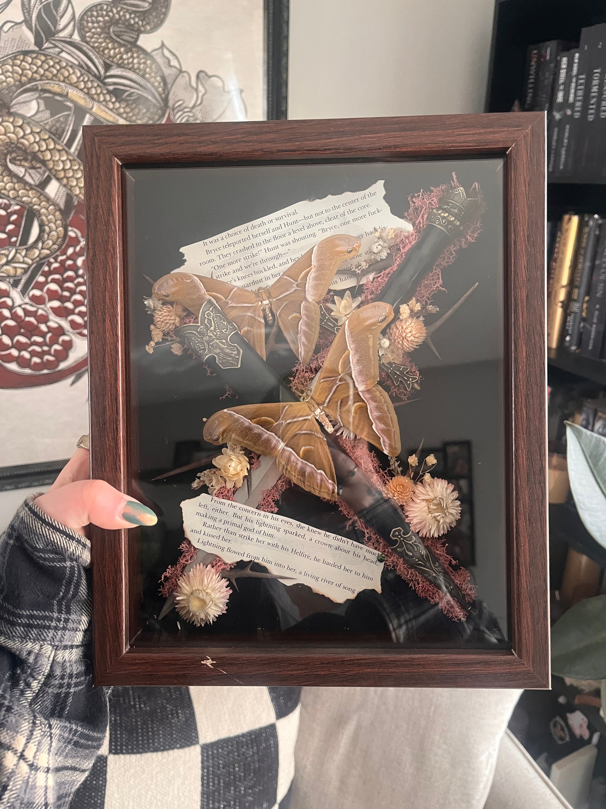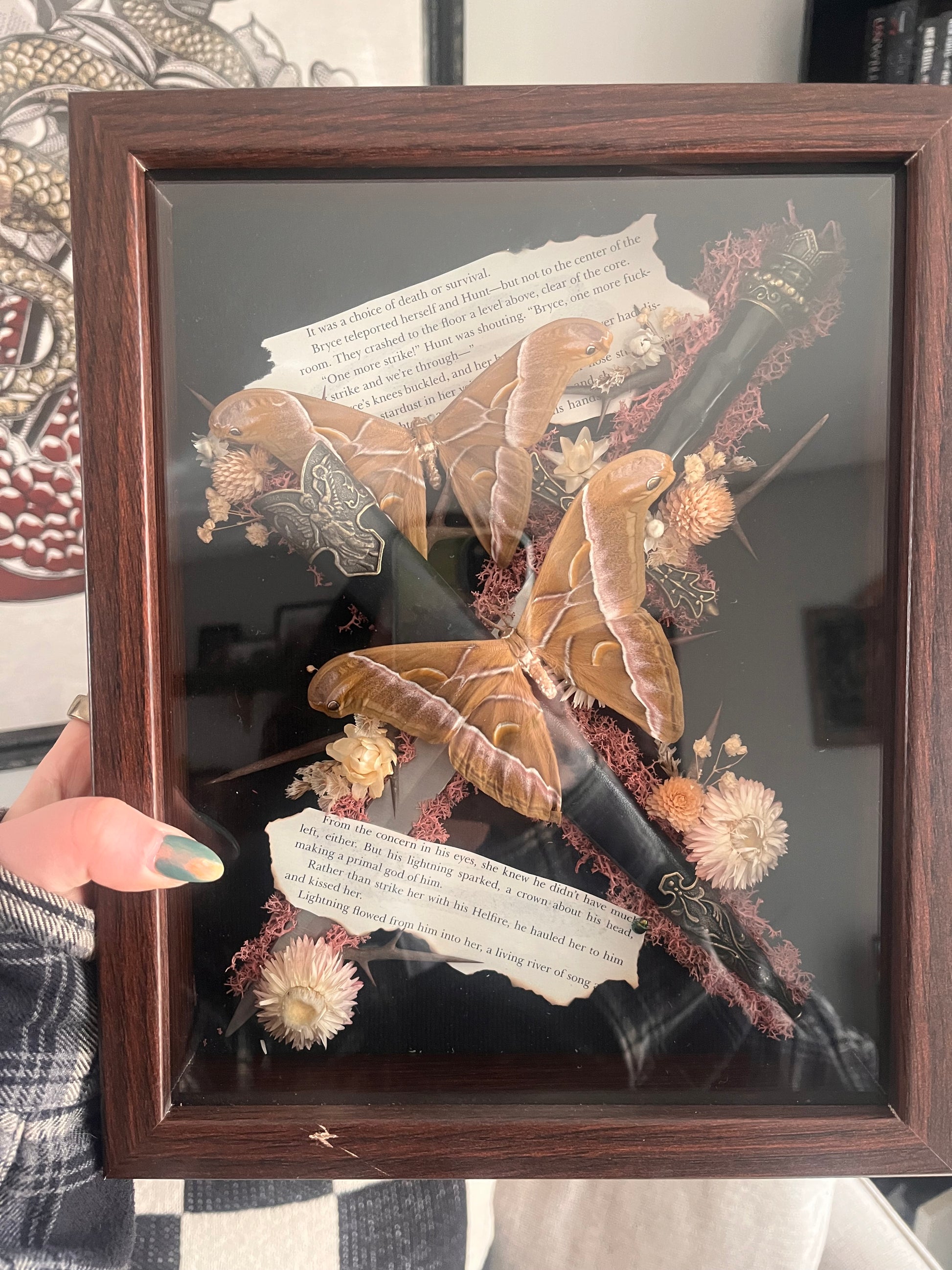 Two moths, a burnt book page from Crescent City and a dagger