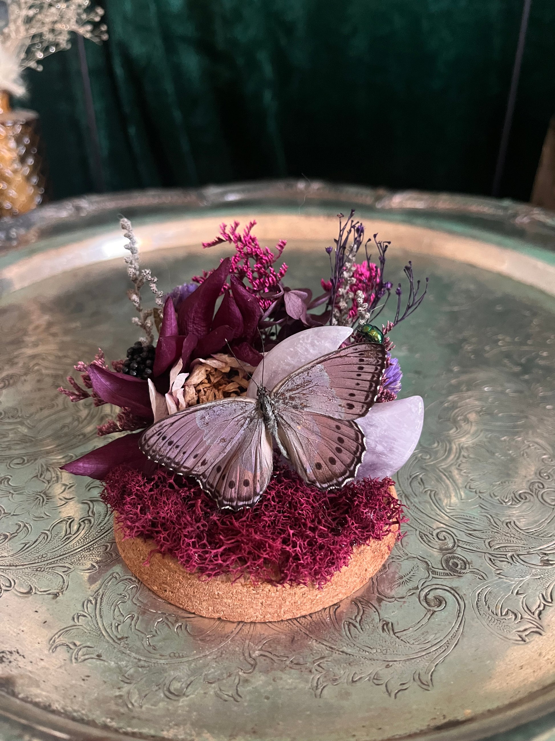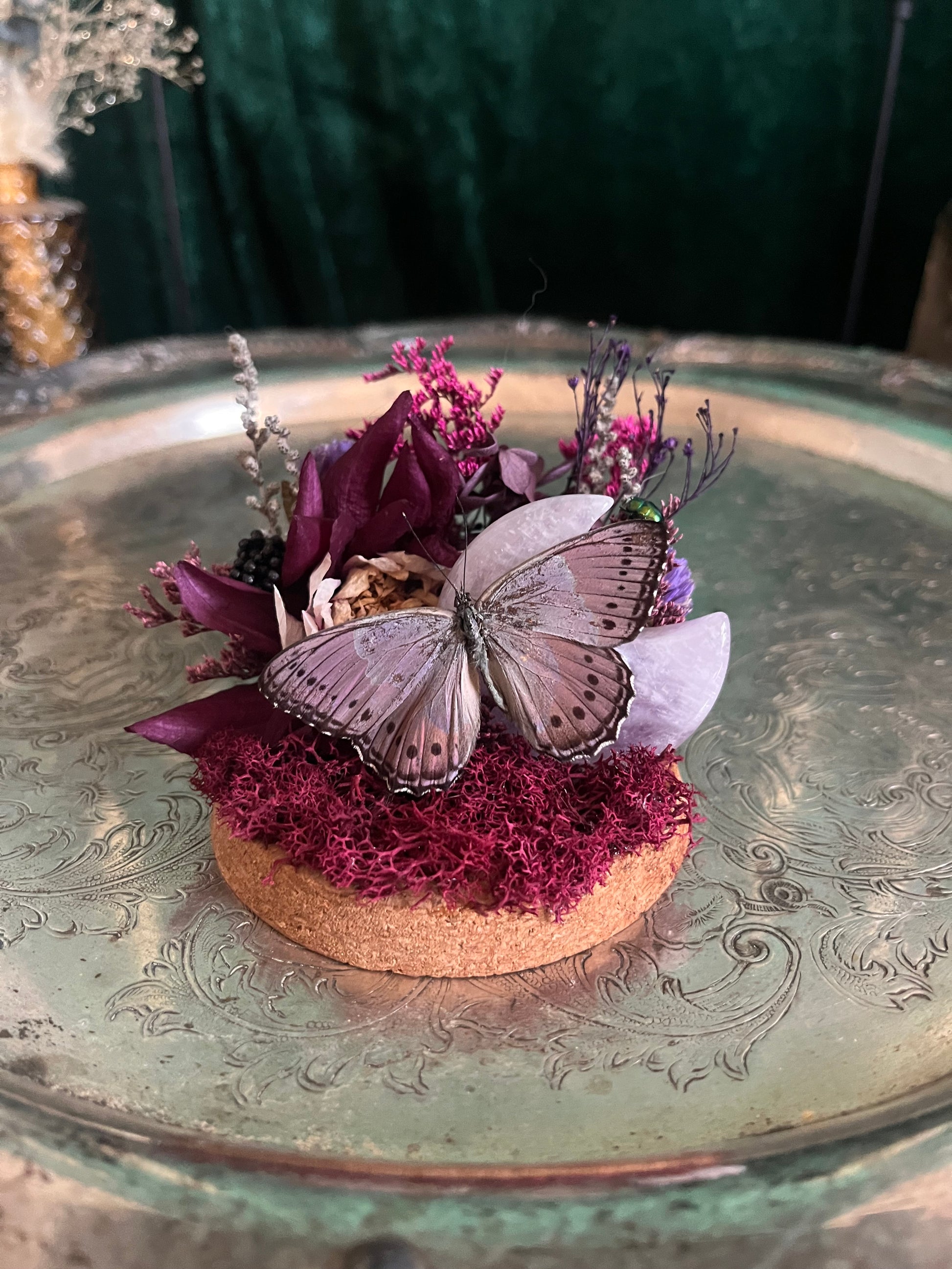 This ornament is ready for your tree! This ornament contains a lavender rose quartz moon, a lilac tree nymph and florals.