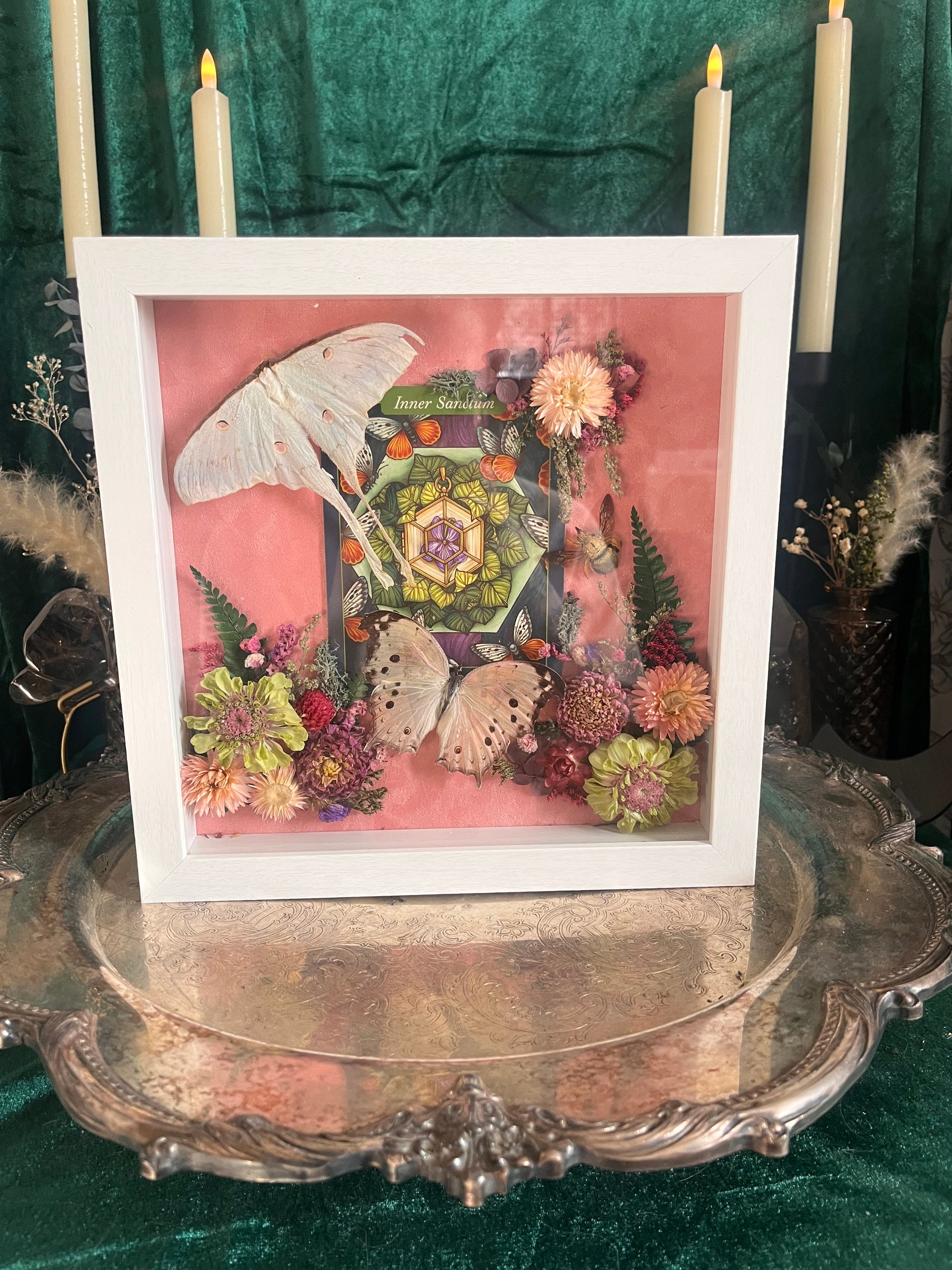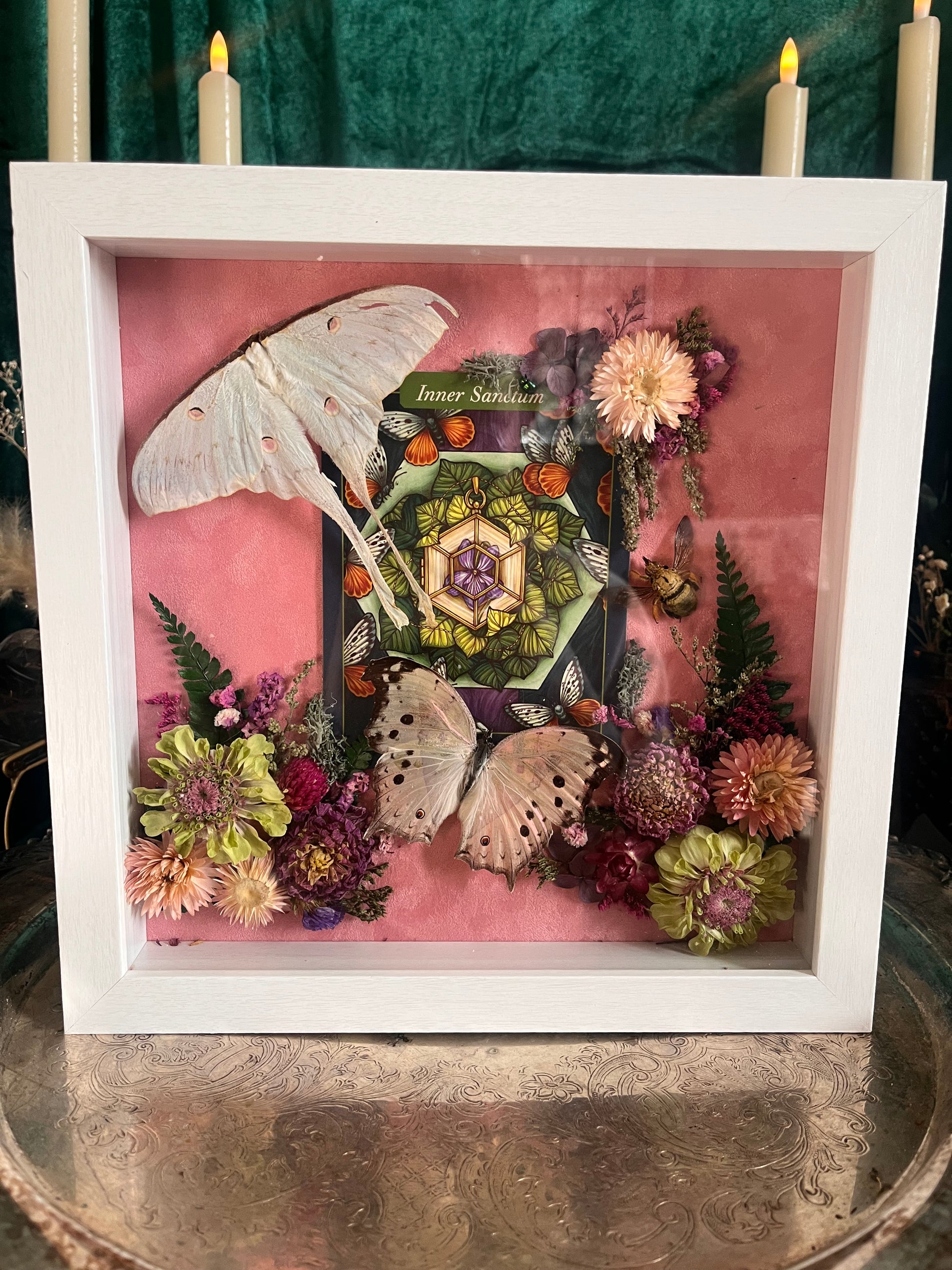 This frame contains an actias celene, a mother of pearl butterfly, an inner sanctum oracle card and gold carpenter bee