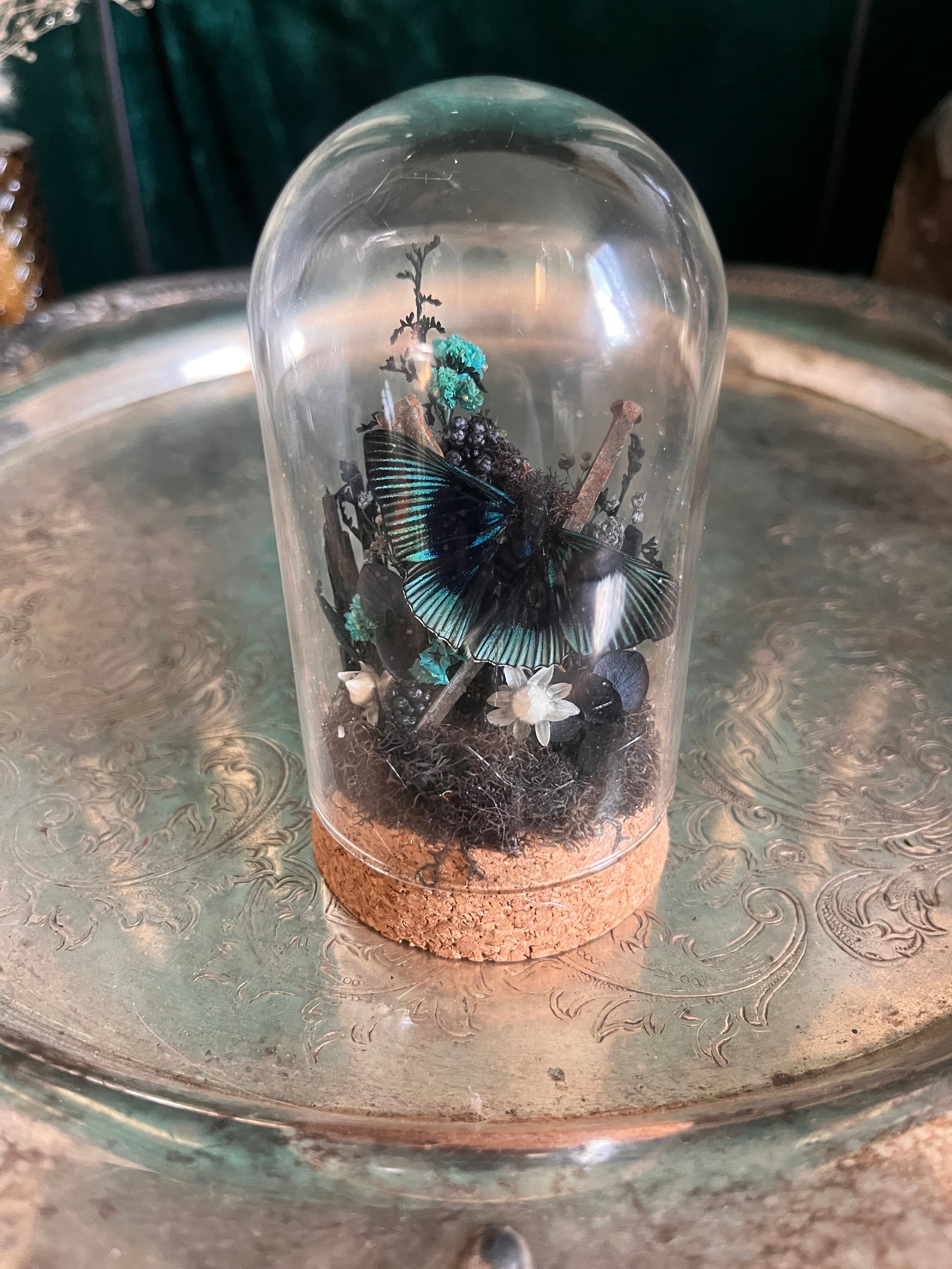 This mini dome contains two coffin nails, an apollo metalmark butterfly and florals.