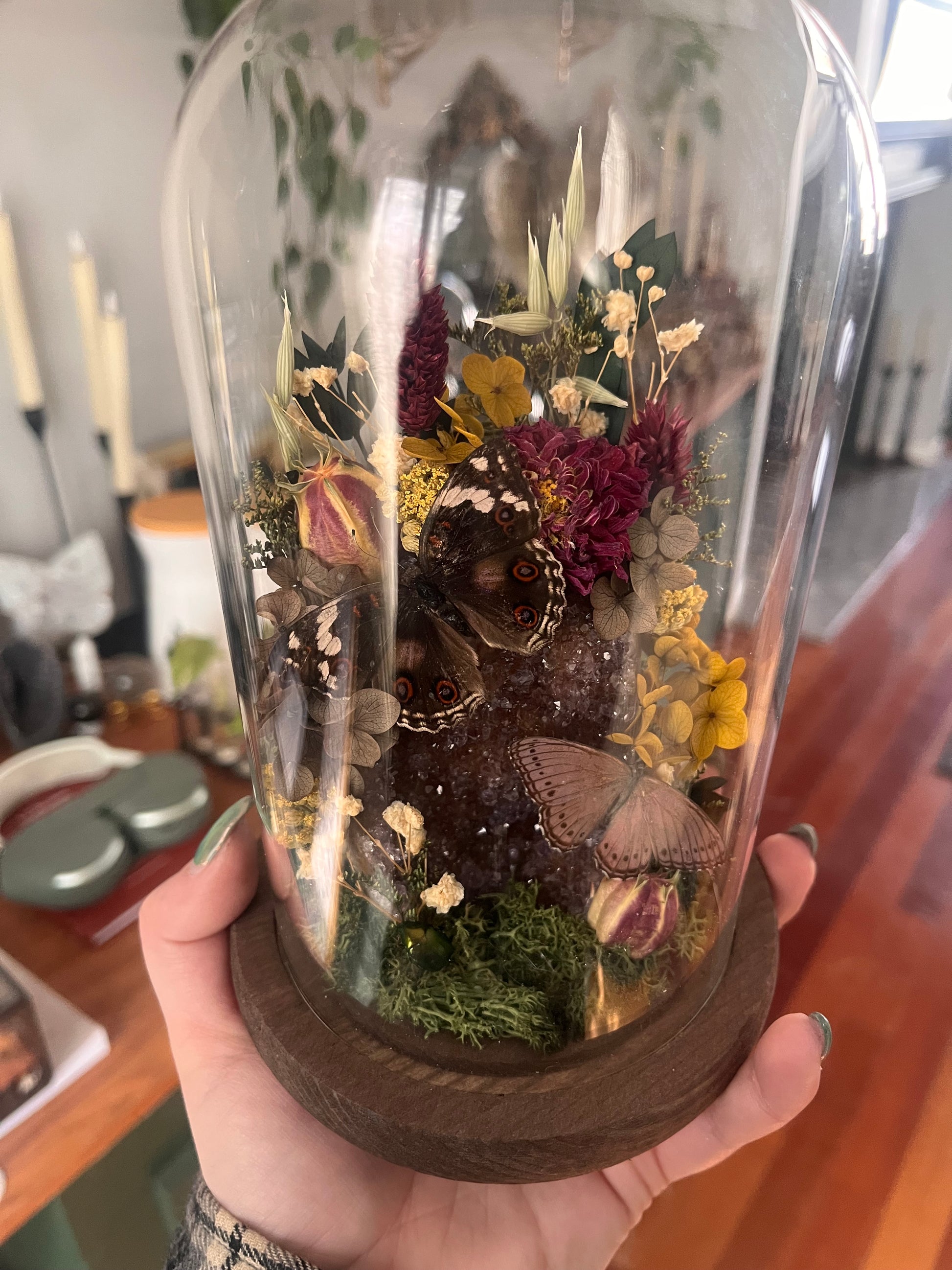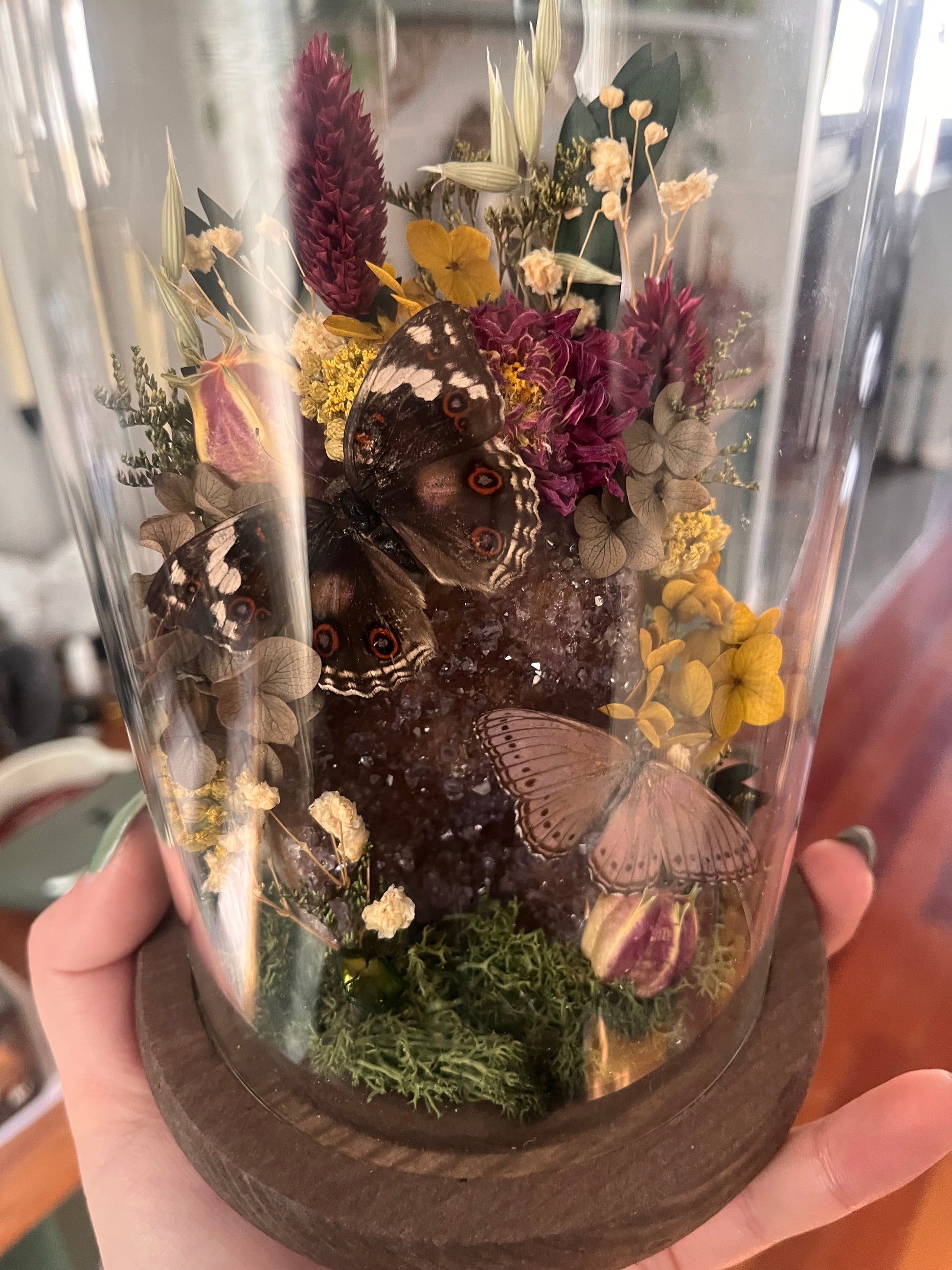 An amethyst cut base with a precise butterfly and a lilac tree nymph